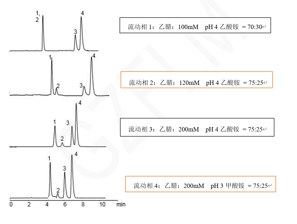 說明:本案例中乙腈比例及緩沖鹽種類和強度的變化帶來磷霉素與庶糖的0分離到完全分離的變化, 以及保留時間上的變化。類似的雜質(zhì)也可通過此類調(diào)整或者梯度調(diào)整條件,實現(xiàn)分離。 在液相中同時分析磷霉素、蔗糖、氨丁三醇及鈉離子是一個復(fù)雜的過程,因為這四種物質(zhì)在化學(xué)性質(zhì)、極性和保留行為上可能存在顯著差異。以下是一種可能的分析策略: