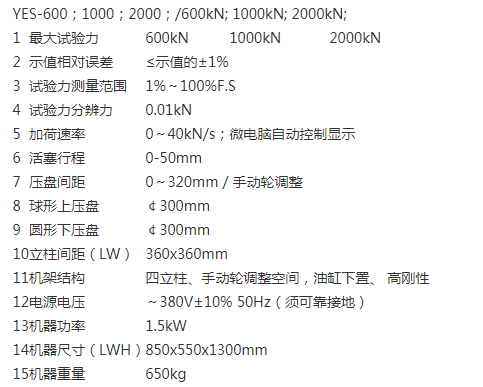 產品規格 YES-600;1000;2000;600kN;1000kN;;2000kN;YES系列經濟型數顯式壓力試驗機
