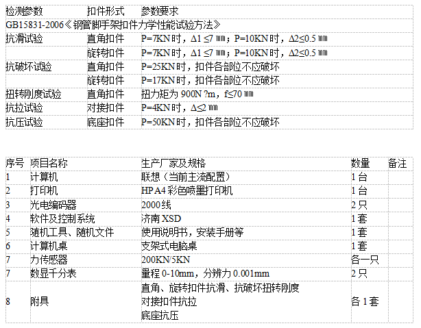 附具:配置:直角、旋轉扣件抗滑、抗破壞;扭轉剛度;對接扣件抗拉;底座抗壓各一套